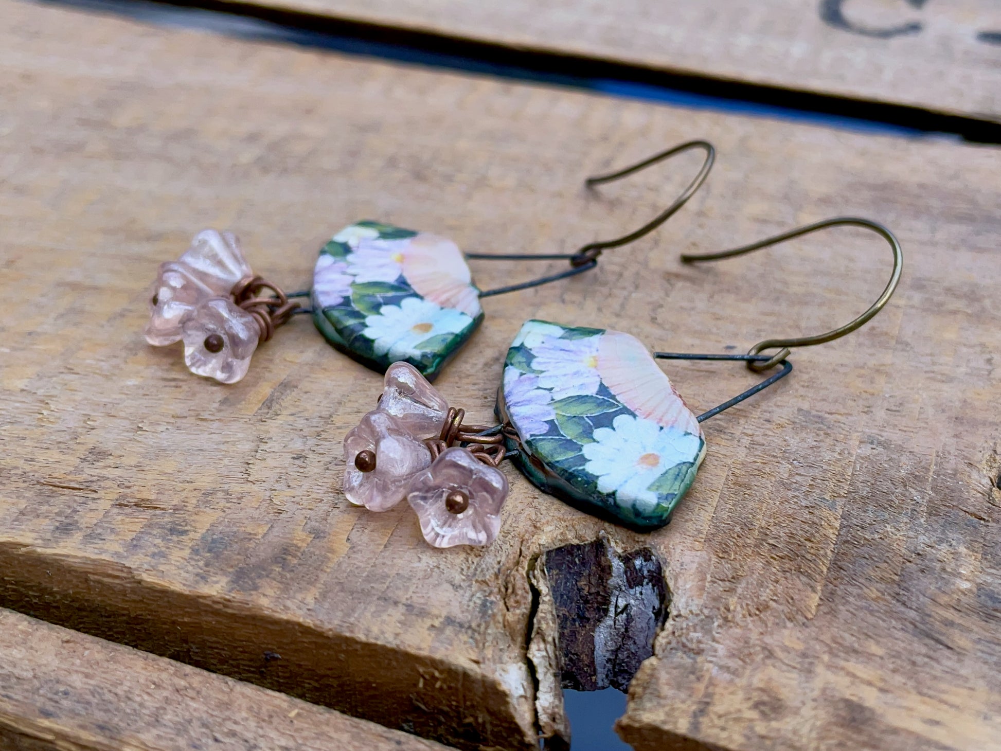 Each pair features fan-shaped ceramic charms created by bead artist Petra Carpreau, decorated with a vintage-inspired floral decal on the front and finished with a soft iridescent glaze on the back.