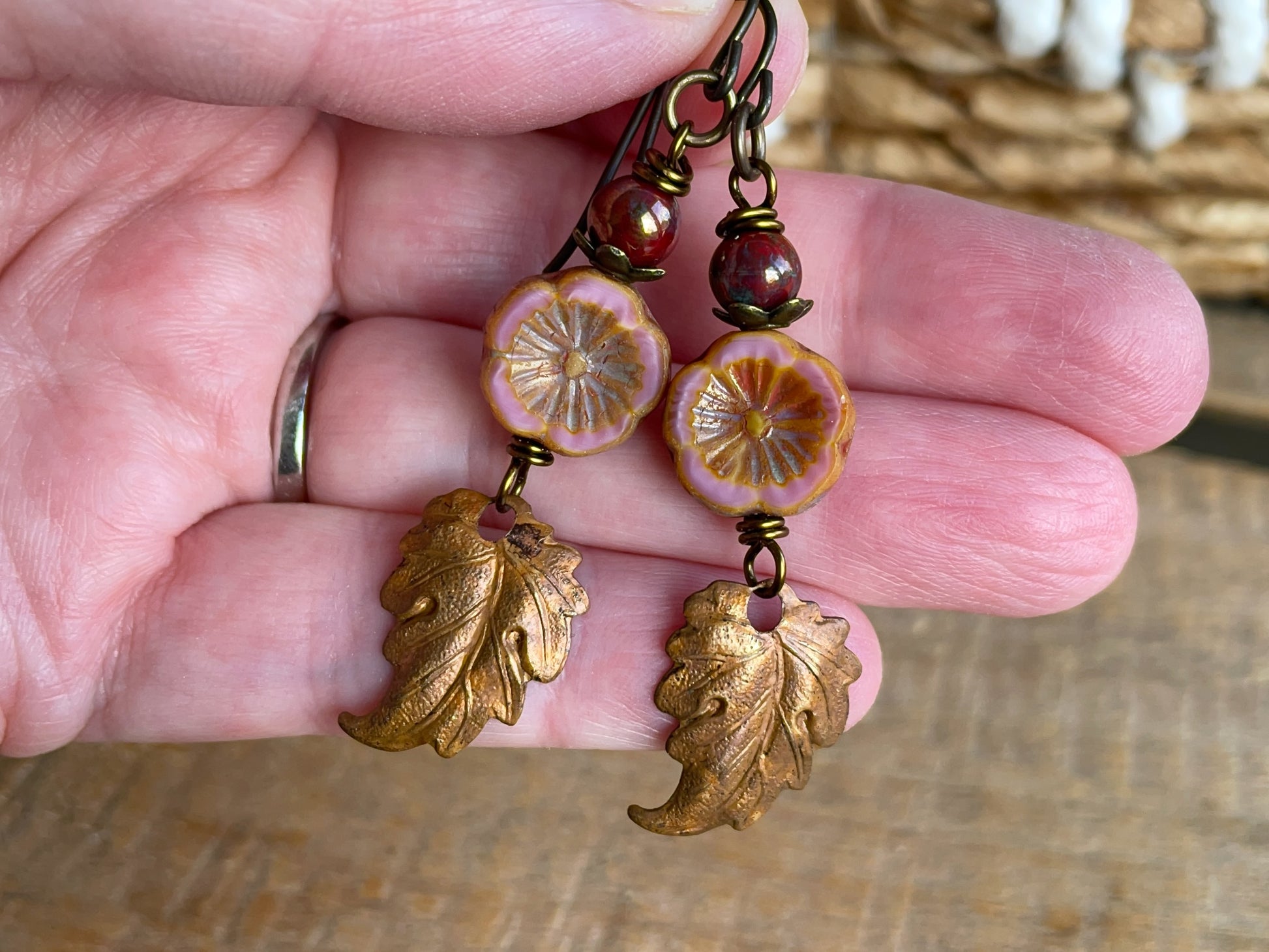 Rustic Autumn Leaf Earrings with Czech Glass Flowers & Copper Leaves | Nature Inspired Jewellery