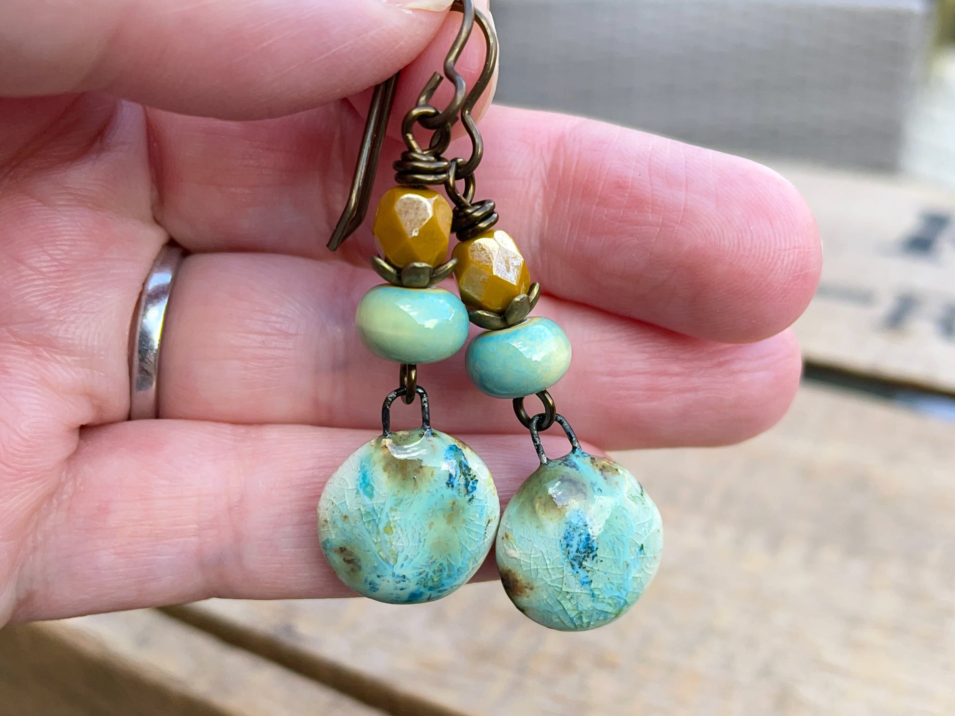 Rustic Yellow & Green Ceramic Dangle Earrings - Artisan Crafted Pottery Jewellery