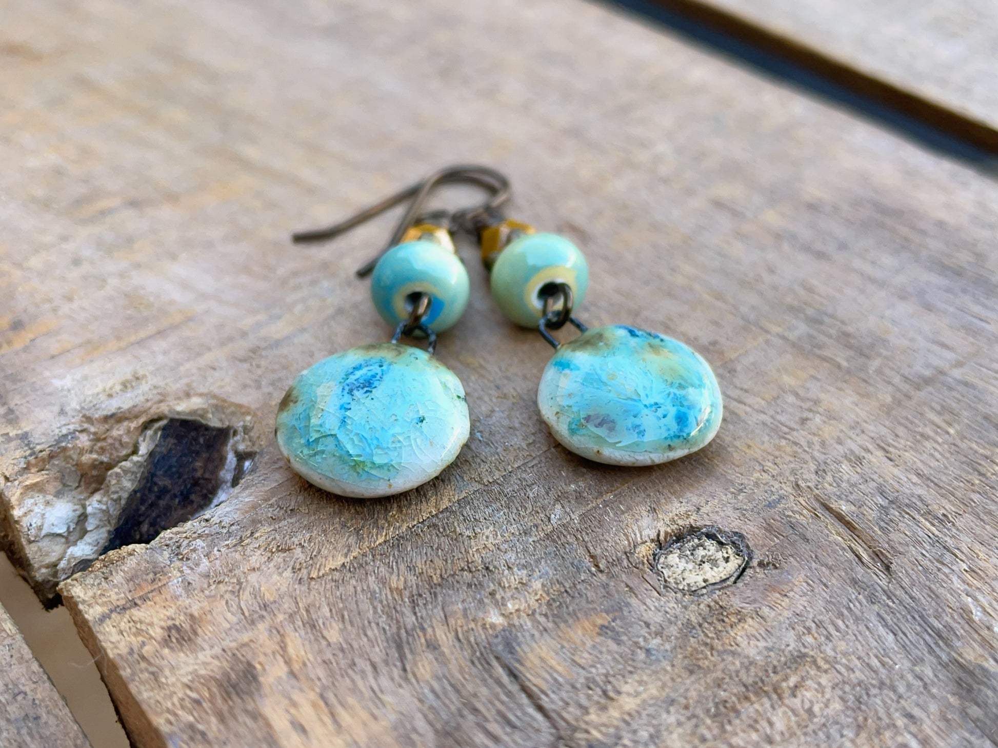 This lightweight pair of earrings feature small ceramic charms, which have been made by bead artist Petra Carpreau. The hand-formed earthstone charms have been beautifully glazed in shades of turquoise, green and golden brown.