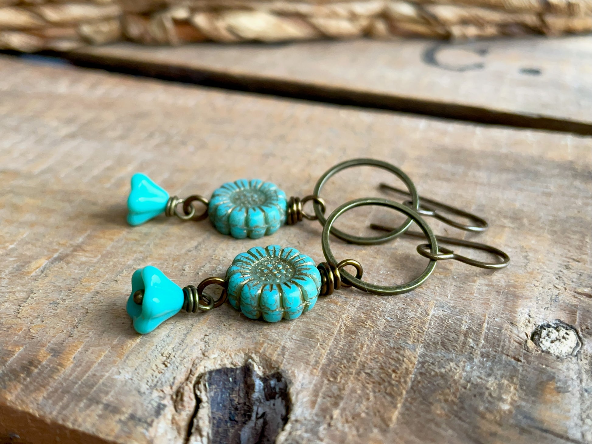 They feature beautifully detailed turquoise Czech glass sunflower beads, finished with an antiqued bronze wash that gently highlights the carved petals and textured centres.